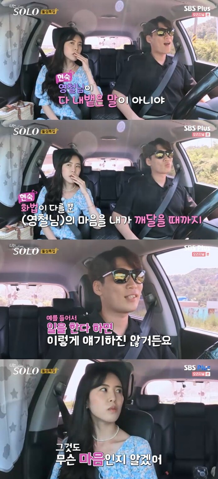 이후 현숙은 영숙에게 영철과의 대화에 대해 전했다. 현숙은 영숙에게 "영철님 화법이 진짜 빙빙 돌려서 얘기한다"며 "진짜 집중해야하는데 지금은 듣지만 이게 될까 싶고 고구마 먹은 느낌이다"라고 말했다. 이어 현숙은 "무섭더라"며 "대화의 방식 이게 개선이 될까 싶다"고 했다. 이에 영숙은 "겪어봐야 알 수 있다"며 "실패가 낫지 후회는 안 된다"고 했다.