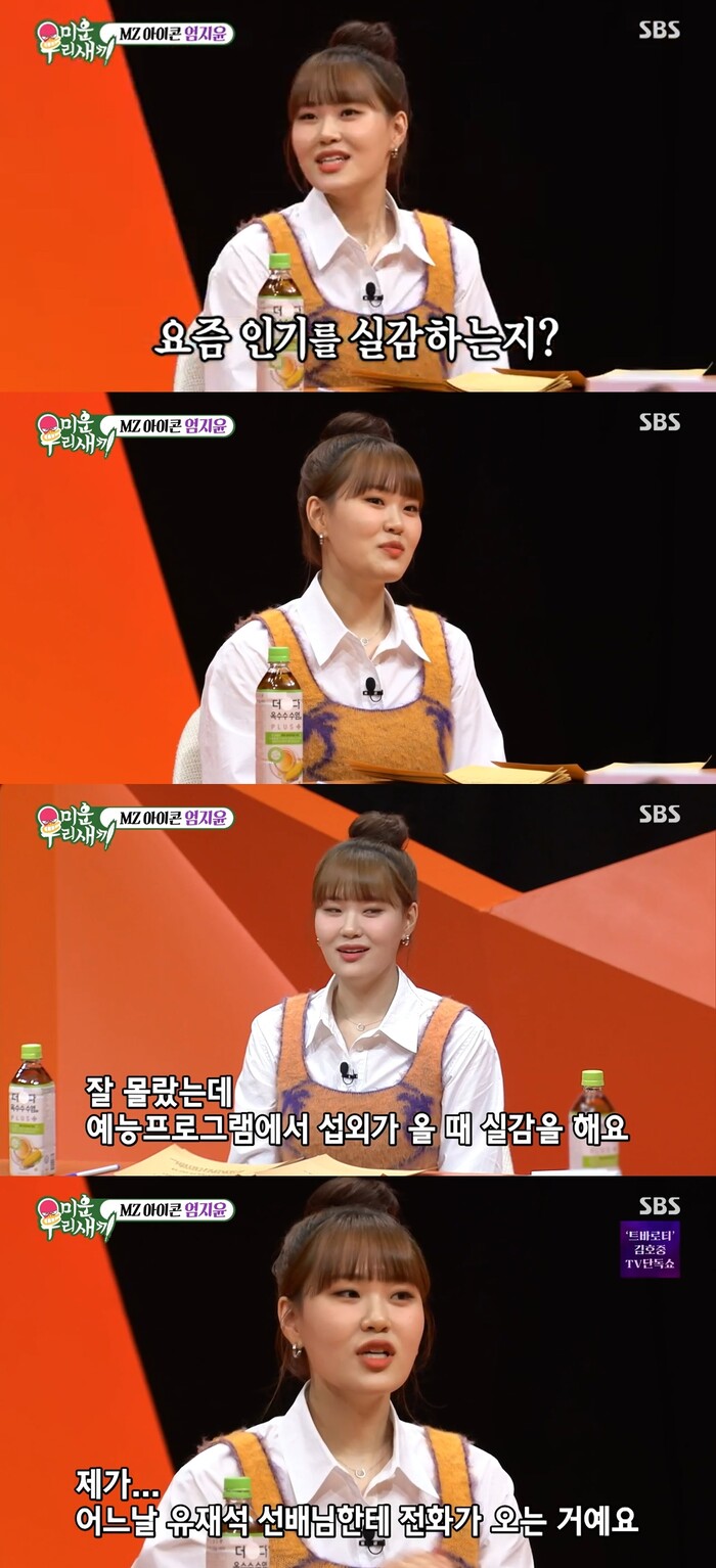 엄지윤은 인기를 실감하냐는 물음에 "잘 몰랐는데 이런 예능 프로그램 섭외가 올 때 느낀다"고 답했다