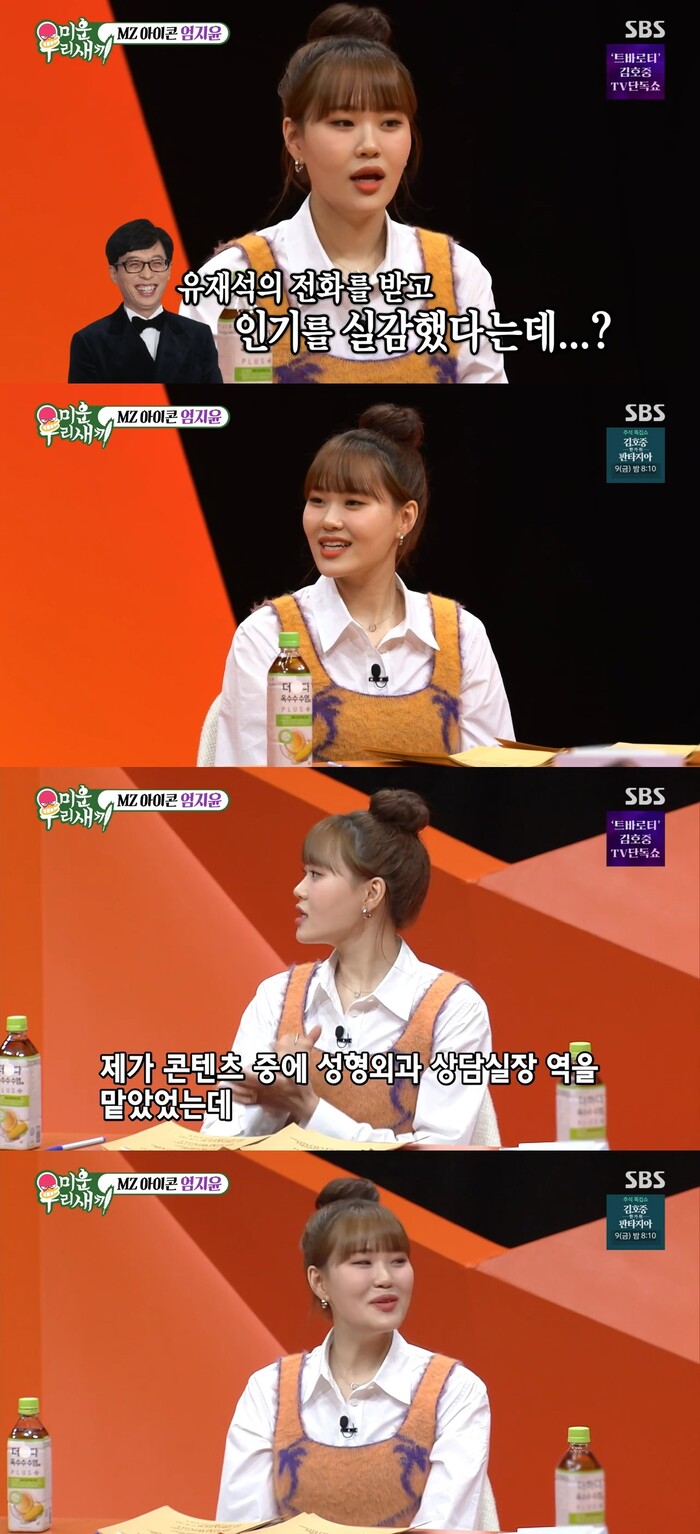 이에 엄지윤은 "어느 날 유재석 선배님한테 전화가 왔는데 바로 받을 수 있었는데 5초 동안 망설였다"며 "프로그램 같이 해줘서 고맙다고 도와줘서 고맙다고 해주셨는데 뭉클한 느낌이 들었다"고 했다.