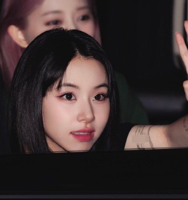 해당 글에 첨부된 사진에는 채영이 차로 이동 중 창문을 내리고 팬들과 인사하는 모습이 담겨있다. 채영은 팬들을 향해 왼팔을 흔들고 있고 여기 왼팔에 채영의 타투가 보였다.