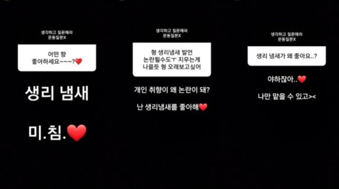 이를 본 다른 네티즌은 "생리 냄새 발언은 논란될 수도, 지우는 게 나을 듯"이라고 지적하자 "개인 취향이 왜 논란이 되냐"며 "난 생리냄새를 좋아한다"고 재차 했다. "생리 냄새가 왜 좋냐"는 물음에는 "야하잖아 나만 맡을 수 있고"라는 답변을 남겼다.