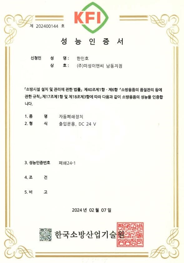 | ▲ 한국소방산업기술원 (KFI, Korea Fire Institute )으로부터 인증받은 성능인증서 (사진:미성 E&C 제공) |