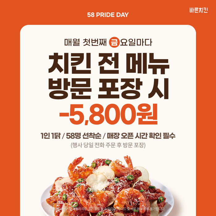 바른데이는 매월 첫 번째 금요일, 포장 고객에 한해 1인당 5800원 할인 혜택을 지급하는 정기 이벤트다. 단, 매장별 선착순 58명에게만 혜택이 주어진다.