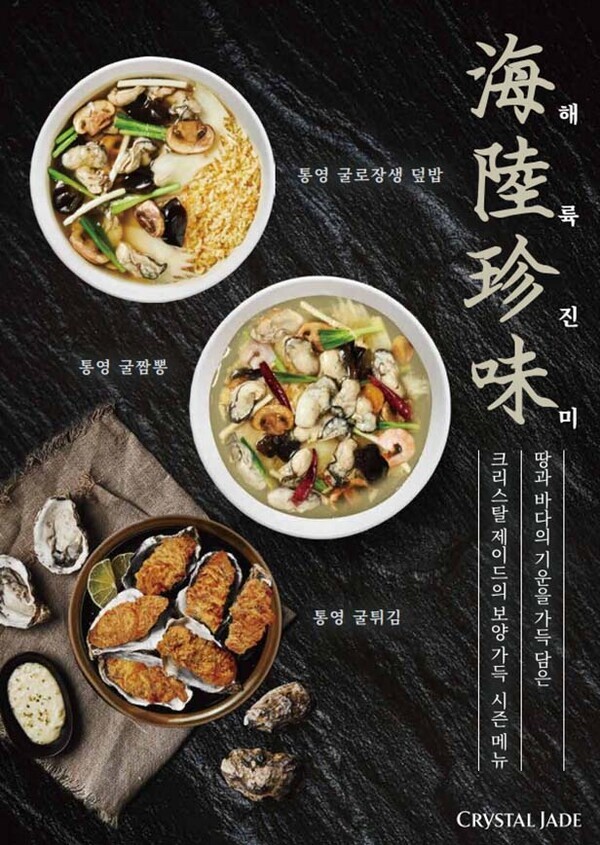 크리스탈 제이드는 ‘해륙진미’를 콘셉트로 바다와 땅의 기운을 받고 자란 신선한 식자재를 활용한 겨울 시즌 메뉴를 내놓았다. 먼저, 맑은 바다에서 자라 알이 굵고 영양분이 풍부한 통영산 굴을 넣은 시즌 한정 메뉴를 선보였다. 신선한 통영굴을 가득 넣은 겨울 시즌의 시그니처 메뉴인 ‘통영 굴짬뽕’과 통영굴과 해산물을 담백한 화이트 소스와 함께 곁들인 ‘통영 굴로장생 덮밥’, 바삭하게 튀겨 타르타르 소스와 함께 즐기는 ‘통영 굴튀김’ 등 3종으로 추운 겨울 기력을 돋울 먹거리로 안성맞춤이다. 이와 함께, 로드샵에 한정해 구황부추를 활용한 메뉴 또한 출시했다. 구황부추는 겨울이면 중국 황제에게 ‘보양식’으로 진상되던 진귀한 식재료로 비타민, 무기질 등 영양소가 풍부하다는 설명이다. 올 겨울에는 구황부추에 돼지고기를 곁들인 ‘구황부추 돼지고기 볶음’과 딤섬, 요리, 식사를 함께 구성한 한정 코스를 판매한다.