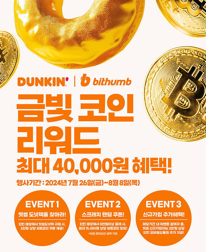 ‘금빛 코인 리워드’는 던킨 매장에서 제품 구매 시 빗썸 앱에서 비트코인으로 교환할 수 있는 쿠폰을 제공하는 이벤트다. 행사는 다음 달 8일까지 약 2주간 진행하며, 만 19세 이상만 참여 가능하다.