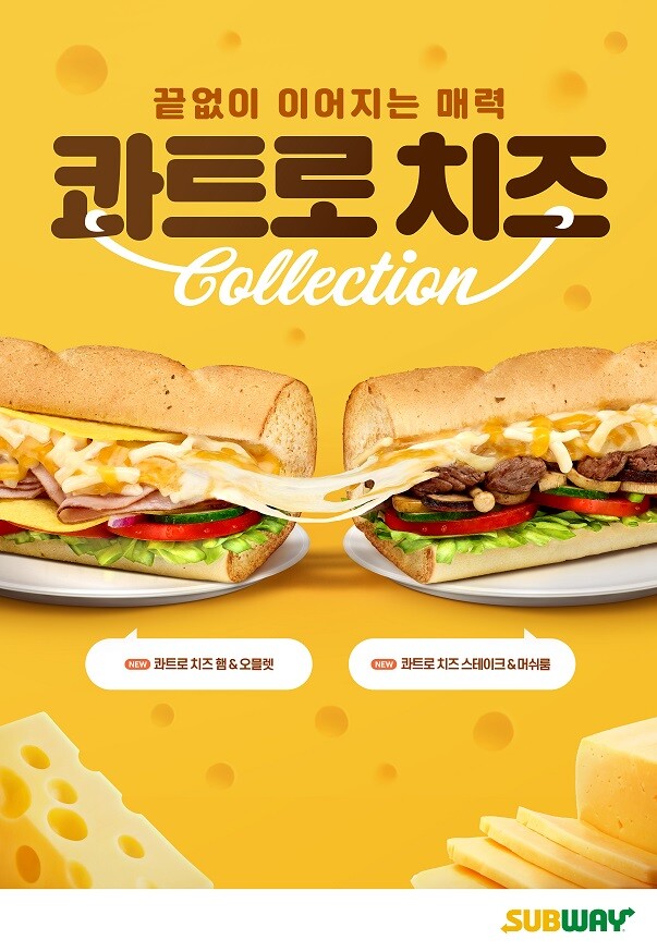 [매일안전신문=김진섭 기자] 써브웨이가 4가지 풍성한 치즈에 스테이크&머쉬룸, 햄&오믈렛을 더한 ‘콰트로 치즈 컬렉션’을 겨울 한정으로 선보인다.