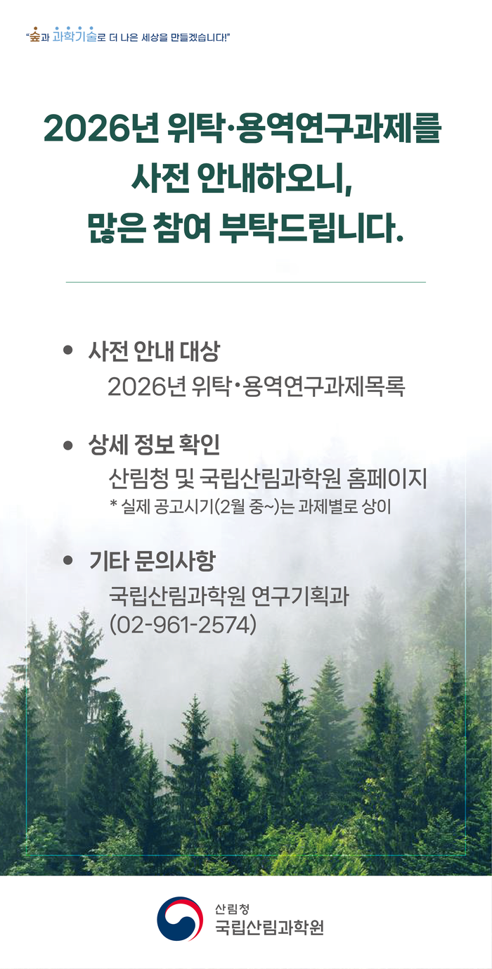 이번 사전 안내는 외부 전문가들의 참여 기회를 넓혀 연구 성과의 전문성을 제고하고, 개방형 연구 네트워크를 활성화하기 위해 마련되었다. 안내 대상은 위탁연구과제 126개, 용역연구과제 57개 등 총 183개 과제 이다. 관련 내용은 오늘 1월 26(월)부터 산림청 및 국립산림과학원 홈페이지, 산림과학기술 관련 학회 등을 통해 확인할 수 있다.
