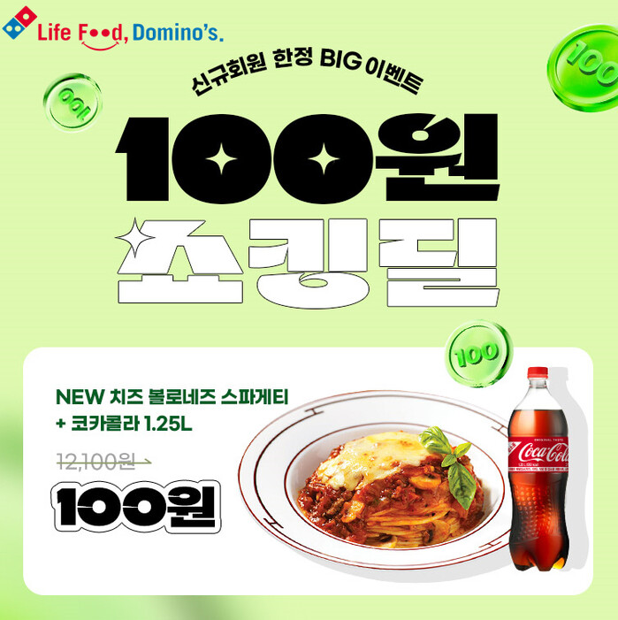 도미노피자는 오는 26일과 27일새롭게 신규 가입한 회원 중 모든 피자 L 구매 시 NEW 치즈 볼로네즈 스파게티+콜라 1.25L를 100원에 이용할 수 있는 쿠폰을 선착순 1만 명에게 제공한다.