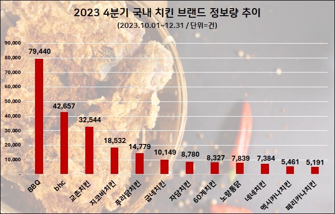 분석 결과, BBQ는 지난해 10월부터 12월까지 7만 9,440건의 정보량을 기록하며 관심도 1위를 차지했다.