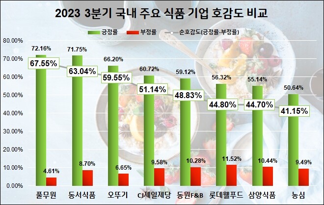 분석 결과 풀무원이 올 3분기 긍정률 72.16%, 부정률 4.61%, 긍정률에서 부정률을 제외한 값인 순호감도가 67.55%를 기록하면서 소비자 호감도 1위에 올랐다.