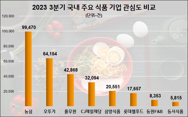 농심이 올 3분기 국내 주요 식품기업 가운데 가장 많은 정보량을 기록하며 관심도 1위에 올랐으며 오뚜기가 뒤를 이었다.