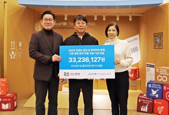 | ▲(왼쪽부터) 박진영 서울시 미래한강본부장, 기부 참여 업체 대표(깡씨푸드),조미진 유니세프 한국위원회 사무총장 (사진제공=유니세프 한국위원회) |