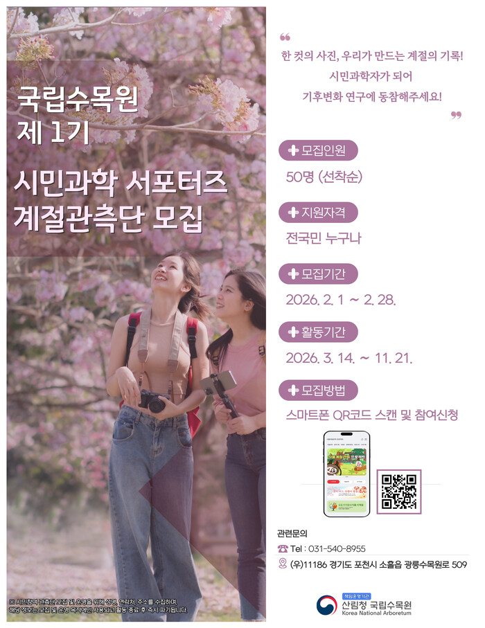 [매일안전신문=김진섭 기자] 산림청 국립수목원이 식물계절 변화를 시민과 함께 기록하는 ‘국립수목원 제1기 시민과학 서포터즈 계절관측단’을 모집한다.