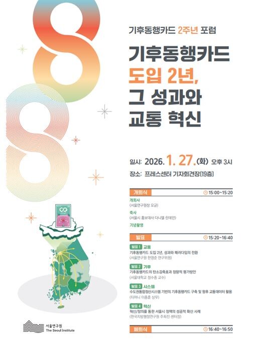 서울연구원이 27일 오후 3시, 한국프레스센터 기자회견장에서 「기후동행카드 도입 2년, 그 성과와 교통 혁신」을 주제로 기후동행카드 2주년 정책 포럼을 개최한다.