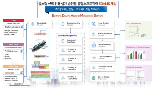 EDAMS는 중소형 선박 설계 계산과 관련법(선박안전법, 어선법 등)에 따른 도면 승인 절차를 하나의 플랫폼에서 수행할 수 있는 통합소프트웨어다.