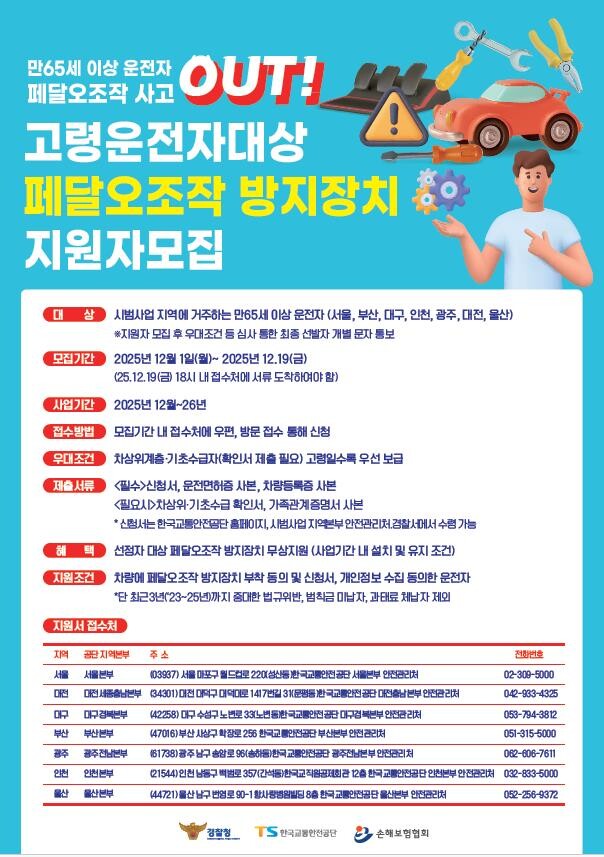 [매일안전신문=이종삼기자] 한국교통안전공단이 경찰청, 손해보험협회와 함께 고령운전자의 안전운전을 위한 ‘페달 오조작 방지 장치 2차 무상 보급 사업’을 추진한다.
