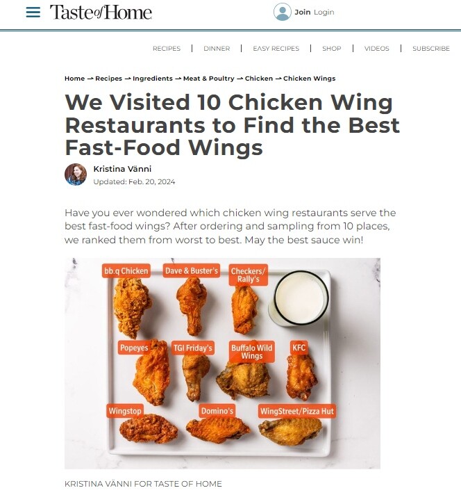 최고의 치킨 이외에도 최고의 윙(날개) 제품에서도 10개의 유명 치킨 브랜드 중 BBQ를 1등으로 꼽았다. “풍부한 육즙과 바삭한 튀김옷, 단맛 후 느껴지는 은은한 매운맛이 계속해서 한 입 더 먹고 싶게 만든다”고 선정 이유를 밝혔다.