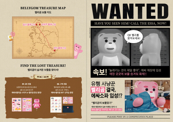 전국 에싸 플래그십 스토어(남양주, 일산, 양산)에서는 방문 이벤트도 진행된다. 매장 곳곳에 숨겨진 당첨 코드가 있는 QR이 삽입된 벨리곰을 찾으면 ‘벨리곰 스티커 2종’ 또는 ‘벨리곰 손풍선’으로 교환할 수 있다.