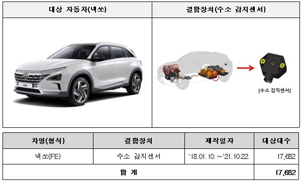 [매일안전신문=손성창 기자] 국토교통부(국토부)는 현대자동차에서 제작 또는 판매한 넥쏘 2018년1월 10일부터 2021년 10월 22일 1만7682대에서 수소 감지센서 제작결함이 발견되어 리콜한다고 밝혔다.