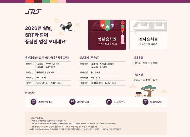 정연성 에스알 영업본부장은 “설 명절 승차권 예매가 안정적으로 운영될 수 있도록 철저히 대비해, 국민 이동 편의를 높이는데 최선을 다하겠다.”라고 밝혔다.