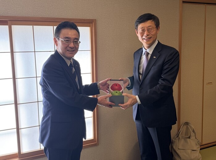 | ▲하치노헤시 구마가이 유이치 시장(좌)과 부산항만공사 송상근 사장 (사진=부산항만공사 제공) |