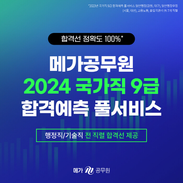 메가스터디교육의 공무원 시험 전문 브랜드 ‘메가공무원’이 오는 23일 2024 국가직9급 공무원 시험에 응시한 수험생을 대상으로 ‘2024 국가직 합격예측 풀서비스’를 제공한다.