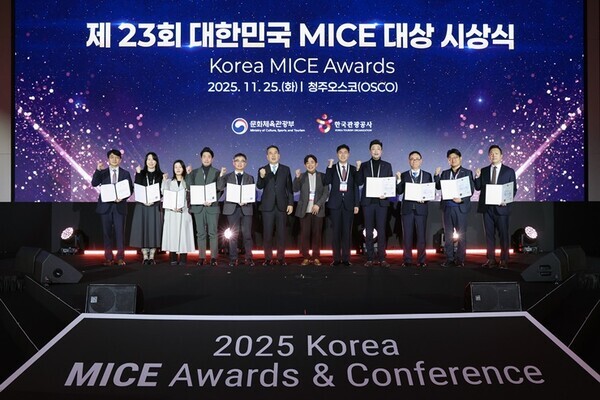 행사 첫날인 25일에는 한국 MICE 산업 발전에 기여한 개인과 단체를 선정해 시상하는 ‘제23회 대한민국 MICE 대상’ 시상식이 열렸다. 문화체육관광부 장관상은 ▲25개국, 1만 1천여 명이 참가한 ‘2025 대한민국 국방산업발전대전 국제컨퍼런스’를 주관한 ‘(사)한국국방MICE연구원’(국제회의 부문) ▲3천여 명 규모의 대형 금융 기업회의를 기획·운영한 ‘㈜멥스인터내셔널코리아’(기업회의·인센티브 부문) ▲2025 APEC 정상회의 개최를 통해 도시 브랜드 인지도를 높인 ‘경주시’(국제회의지구 부문) 등이 수상했다.