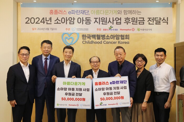 홈플러스 사회공헌재단 e파란재단과 아름다운가게가 지난 7일 마포구에 위치한 한국백혈병소아암협회에서 기부금 전달식을 가졌다고 8일 밝혔다.