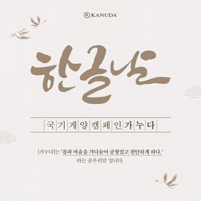 가누다 관계자는 “순우리말 이름을 쓰는 브랜드로서 매년 뜻깊은 국기 게양 캠페인을 진행하고 있어 보람을 느낀다”며 “우리말의 소중함을 다시 한 번 가누다와 함께 되새기고 한글날 태극기를 게양하는 소비자들이 더 많아졌으면 한다”고 말했다.