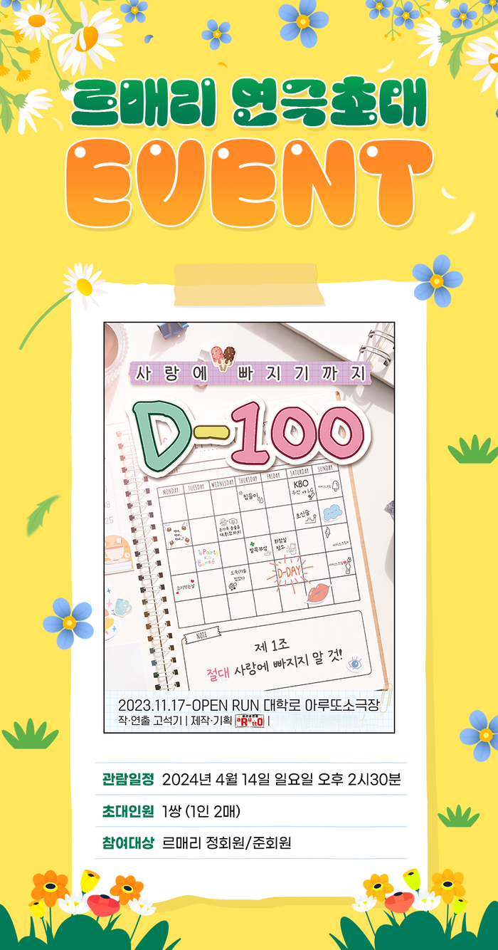 준비된 이번 공연은 연극 ‘사랑에 빠지기까지 D-100’으로, 연애 세포를 자극하는 100일간의 계약 로맨스를 유쾌하게 담았다. 관람 일정은 이달 14일 일요일, 오후 2시 30분 공연으로 회차가 지정되어 있다.