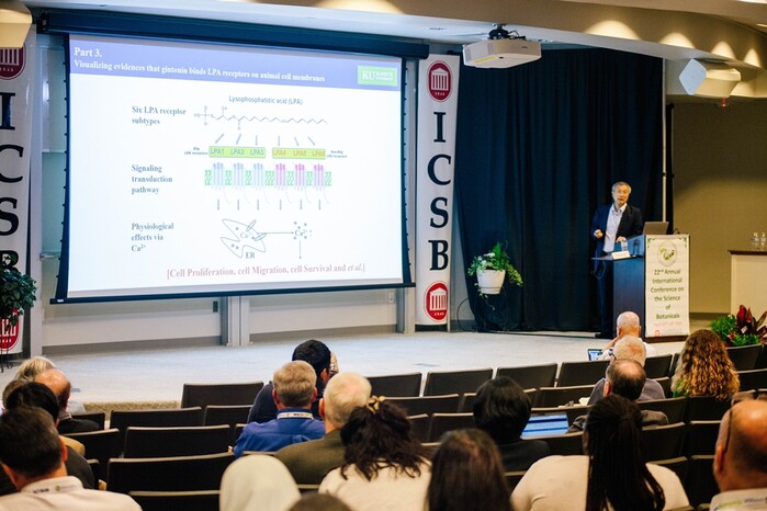 | ▲건국대학교 나승열 교수가 국제천연물과학회(ICSB)에서 홍삼의 효능에 대해 발표하고 있다. (사진=KGC인삼공사) |