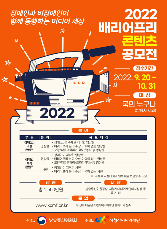방통위와 시청자미디어재단은 장애인의 미디어 참여를 확대하고 장애에 대한 인식을 개선하기 위해 ‘2022 배리어프리 콘텐츠 공모전’을 개최한다고 20일 밝혔다.