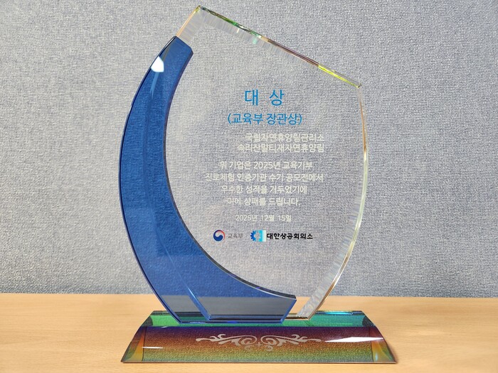 [매일안전신문=김진섭 기자] 산림청 국립자연휴양림관리소 속리산말티재자연휴양림이 교육부와 대한상공회의소가 주관하는 교육기부 진로체험 인증기관 수기 공모전에서 대상을 수상했다.