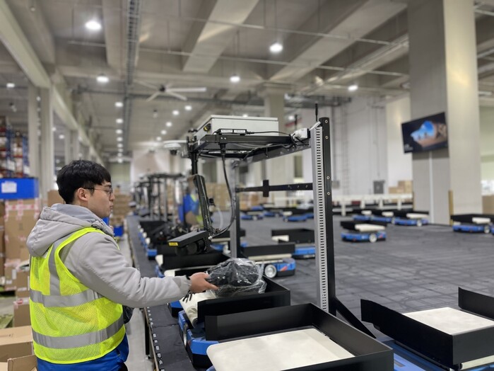 | ▲미니 AGV가 상품을 하나씩 실어 배송지별로 분류하고 있다. (사진=CJ대한통운) |