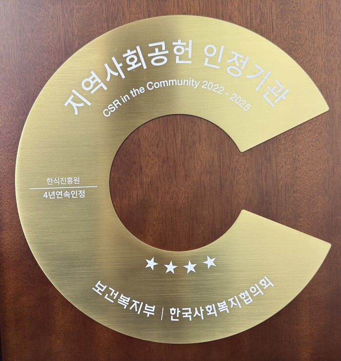 이규민 한식진흥원 이사장은 “지역사회공헌 인정제 4년 연속 선정은 지역사회와 사회적 가치 실현을 위한 한식진흥원의 꾸준한 노력이 인정받은 결과”라며, “향후에도 지역의 발전과 상생을 위해 다양한 활동을 추진하고, 실질적 도움이 되는 공헌을 펼쳐나가겠다”고 밝혔다.