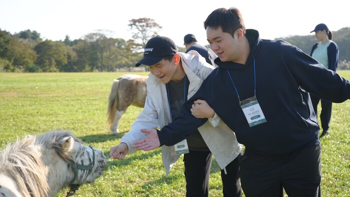 | ▲제주도 라벤더 팜에서 자원봉사자와 함께 제주 말 먹이주기 체험을 하고 있다. (사진=한국공항공사 제공) |