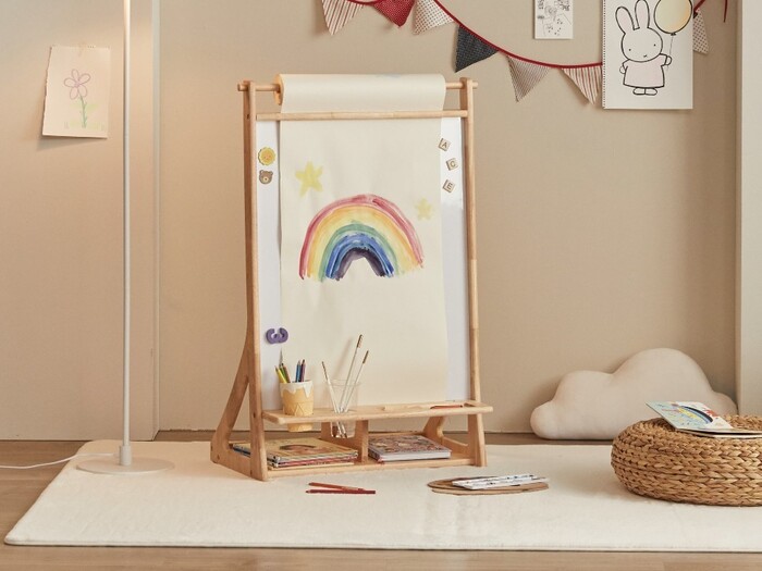 이번에 리뉴얼을 통해 기존 이젤의 프레임 각도를 조절해 아이들이 더욱 안정감 있게 사용할 수 있도록 했고, 하단에 수납 선반을 추가해 다양한 교구, 미술도구, 장난감을 정리할 수 있도록 했다. 또 강철을 사용하지 않아 휘거나 녹이 스는 현상을 방지했다.