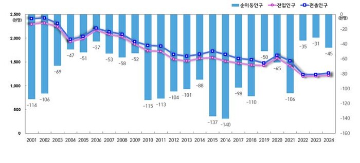 | ▲서울시 전입, 전출, 순이동자(전입-전출)수 추이(2001 ~ 2024년) (사진=서울시 제공) |