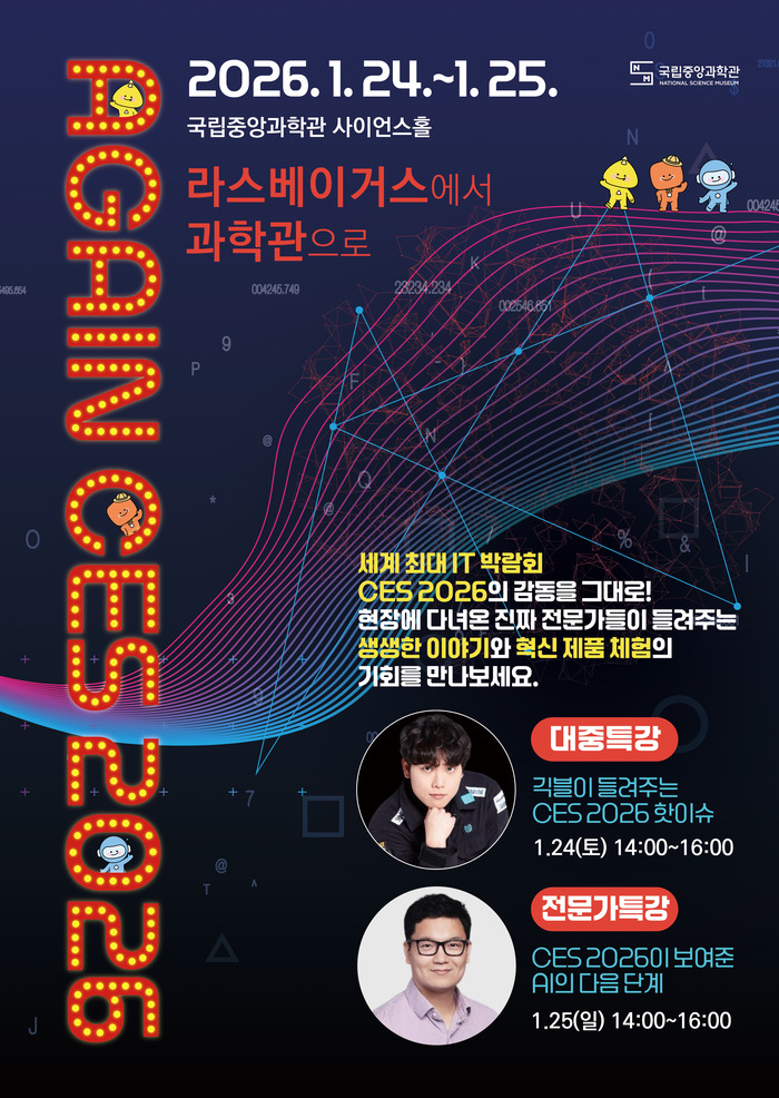 행사 첫날인 1월 24일에는 과학교육 분야에서 높은 인기를 얻은 ‘긱블(수드래곤)’이 강연자로 나서 CES 2026 현장을 직접 경험한 과학관 큐레이터와 함께 생생한 현장 이야기와 기술적 핫이슈를 전할 예정이다. 1월 25일에는 10년간 CES 현장을 취재해 온 현장 기반 분석 전문가인 엄메이징HRD 이선 작가가 ‘CES 2026이 보여준 AI의 다음 단계’라는 주제로, CES 2026 현장에서 확인한 변화를 전하고 좀 더 전문적인 인사이트를 제공하는 강연을 진행한다.
