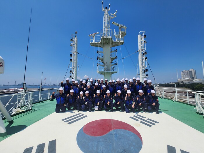 | ▲지난 7월 특별 승선실습을 수료한 교육생들이 단체 기념사진을 촬영하고 있다. (사진=인천항만공사 제공) |