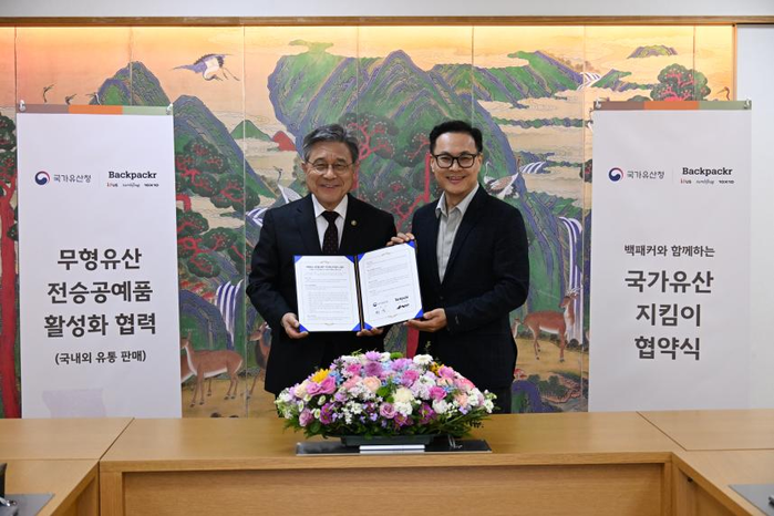 국가유산청이 온라인 상거래(커머스) 기업 ㈜백패커와 지난 21일 국립고궁박물관 회의실(서울 종로구)에서 무형유산 전승 활동지원 등을 위한 국가유산지킴이 협약을 체결했다고 24일 밝혔다.