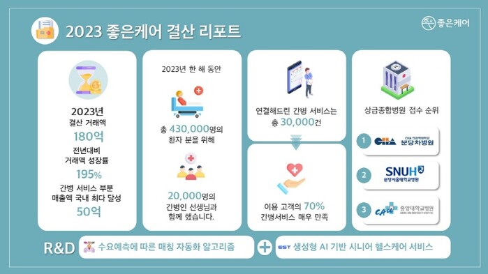 좋은케어는 오프라인이 주가 되던 기존 간병 시장에서 2019년부터 최초로 온라인 플랫폼 서비스를 도입했다. 간병인의 서비스 이력, 후기, 평점 등 이용 전 사용자가 직접 확인 후 원하는 간병인을 선택할 수 있다.