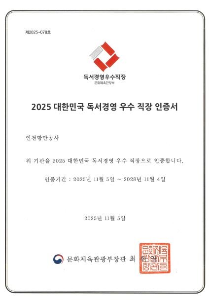 [매일안전신문=김진섭 기자] 인천항만공사가 문화체육관광부로부터 ‘2025 대한민국 독서경영 우수 직장’으로 재인증되었다.
