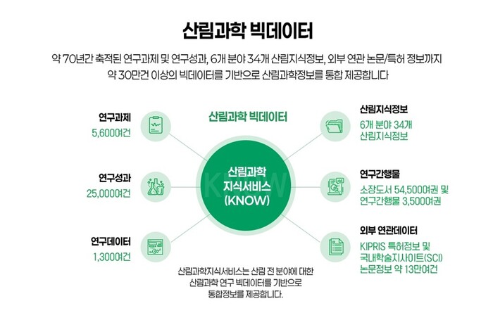 국립산림과학원 산림과학지식서비스는 1958년부터 수행된 5,600여 건의 연구사업 정보, 연구성과물 25,000여 건, 연구데이터 1,300여 건, 6개 분야 34종의 산림지식 DB 등 방대한 빅데이터를 포함하고 있다.