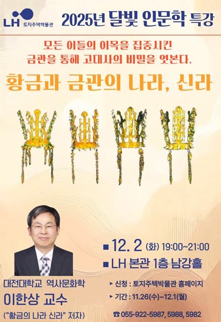 [매일안전신문=김진섭 기자] 한국토지주택공사 오는 12월 2일 '황금과 금관의 나라, 신라'를 주제로 명사 초청 특강을 개최한다.