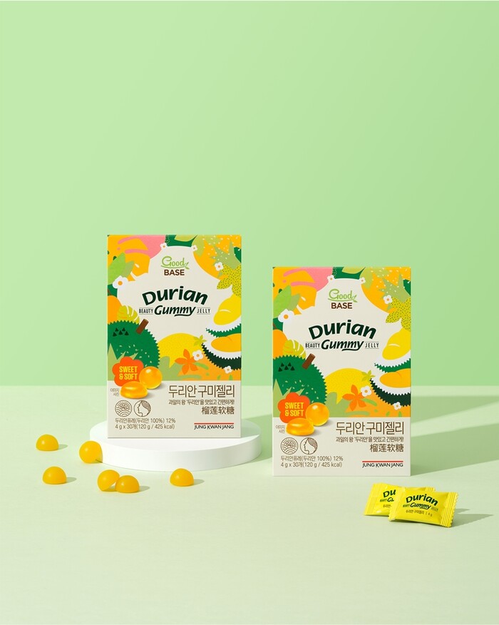 ‘굿베이스 두리안 구미젤리’는 달콤하고 고소한 두리안에 비타민 B1, B2, B6, C, 엽산 등 풍부한 영양분을 더한 제품이다. 특히 두리안 과일이 궁금하지만 특유의 냄새로 인해 선뜻 시도하기 어려웠던 사람도 안심하고 먹을 수 있는 부담 없는 맛과 향으로 남녀노소 누구나 즐길 수 있다.