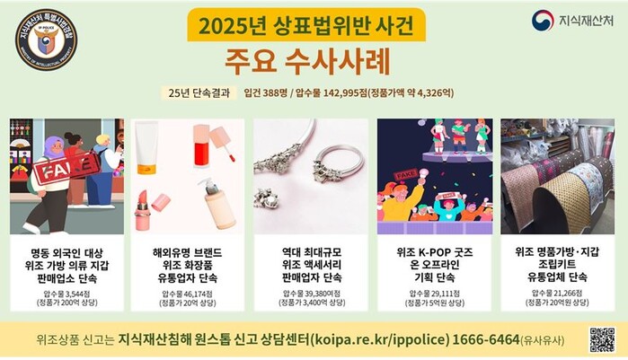 [매일안전신문=김진섭 기자] 지식재산처가 지난해 상표권 침해와 위조상품 유통에 대한 전방위적인 단속을 통해, 상표권 침해사범 388명을 형사입건하고, 위조상품 약 143천여 점(정품가액 4,326억원 상당)을 압수했다.