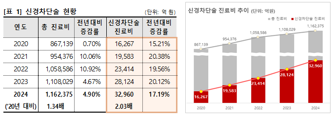 분석 결과 ’24년 신경차단술을 받은 수진자는 965만명으로 총 6504만건의 시술을 받았고, 그에 따른 진료비는 3조2960억원이 지출돼 ’20년 1조6267억원에 비해 5년간 2.03배 증가했다. 이러한 증가 수준은 건강보험 총 진료비가 ’20년 86.7조원에서 ’24년 116.2조원으로 5년간 1.34배 증가한 것보다 훨씬 더 큰 폭으로 증가한 것이다.