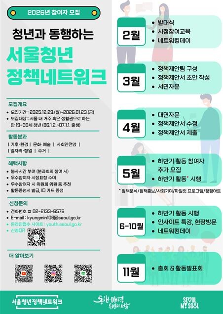 [매일안전신문=이종신 기자] 서울시가 청년이 서울시정에 참여해 정책을 제안하는 서울청년정책네트워크 신규 위원 350명을 모집한다.