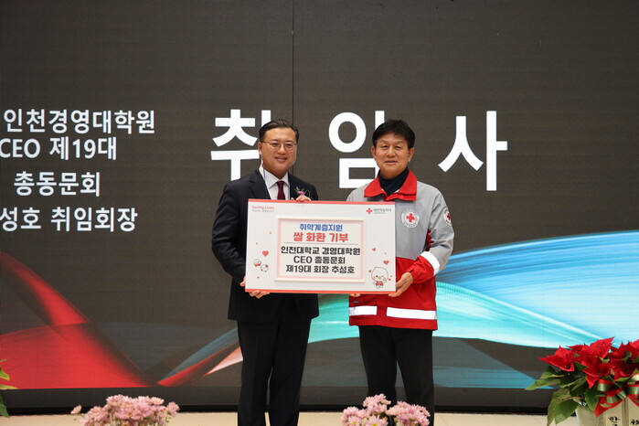 대한적십자사 인천지사가 16일 인천대 경영대학원 CEO 총동문회 제19대 회장 추성호 신임 총동문회장으로부터 취약계층 지원을 위한 쌀화환을 전달받았다고 17일 밝혔다.